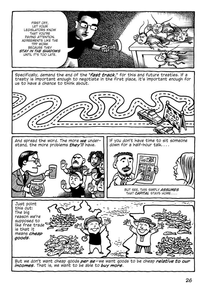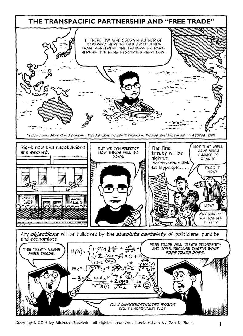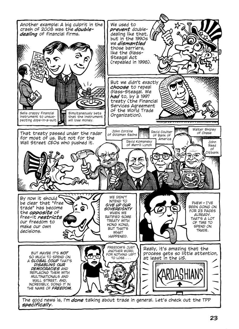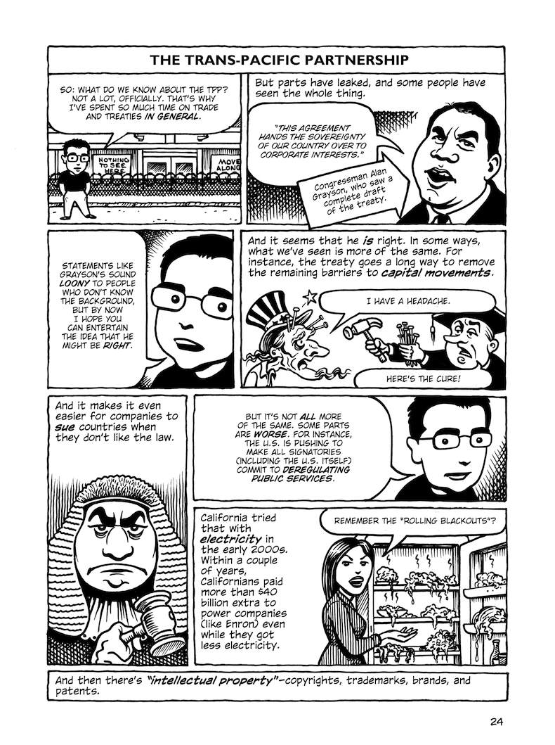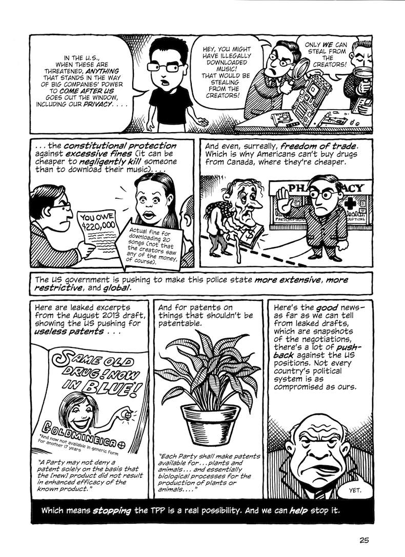 This comic about the Trans-Pacific Partnership was originally published in early 2014, when the full text of the agreement hadn’t been released; the final text was more or less what was expected (slightly better in some parts, worse in others). But in any case, the TPP is dead.
