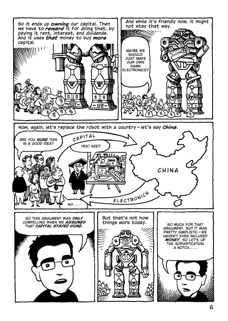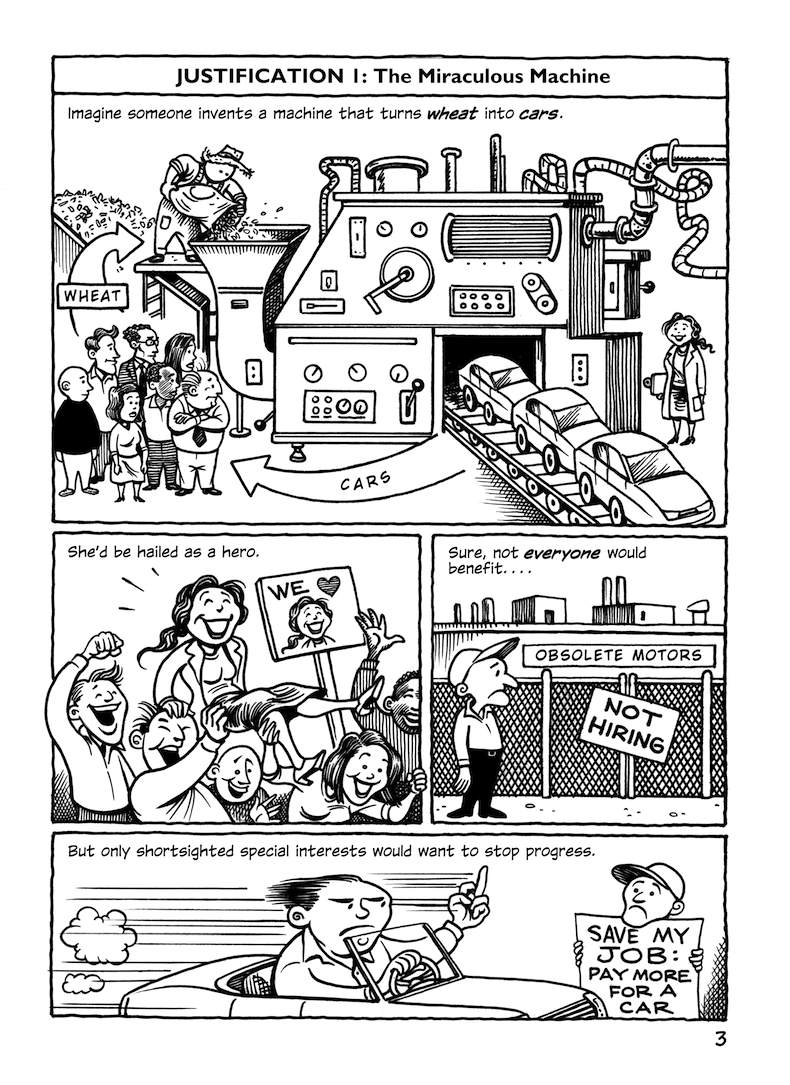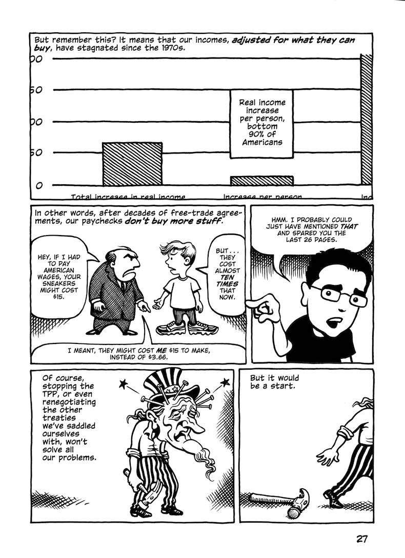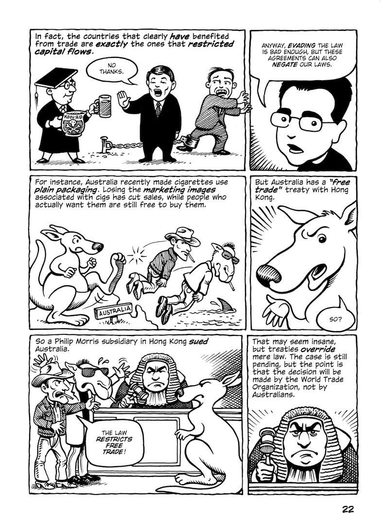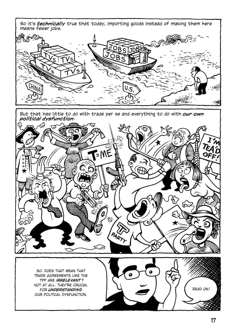 This comic about the Trans-Pacific Partnership was originally published in early 2014, when the full text of the agreement hadn’t been released; the final text was more or less what was expected (slightly better in some parts, worse in others). But in any case, the TPP is dead.