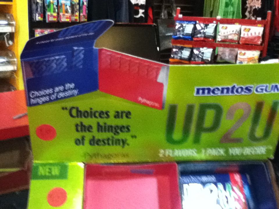 So today I saw a great satire of that system–a fake gum that took the celebration of meaningless choice to absurd levels. Complete with a Pythagoras quote: “Choices are the hinges of destiny.”