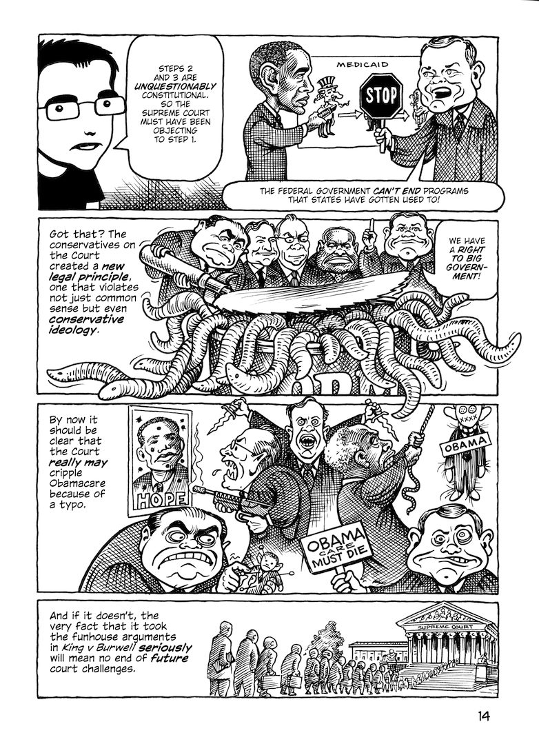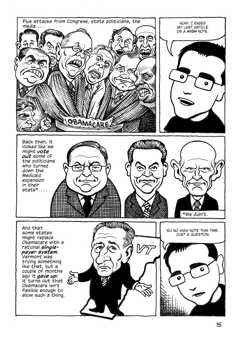 So, before the Obamacare piece was done I made some changes–I had too many batshit-angry conservatives everywhere, which was all about me venting rather than actually educating. But it’s some awesome art, so here are the pages I had to take out: